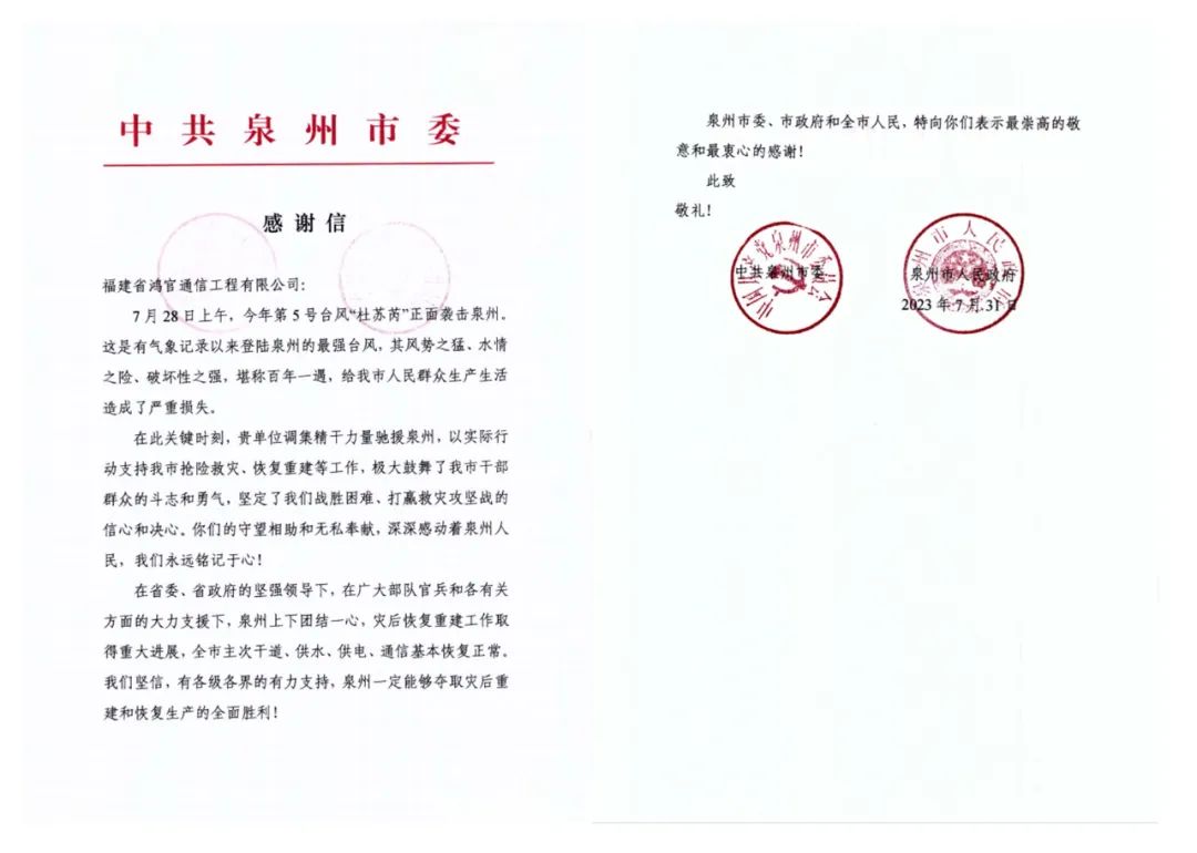 每一個(gè)基站的恢復(fù),每一段光纜的搶通,都凝聚著鴻官公司搶修人員的辛勤汗水和艱辛付出,他們?nèi)虋^戰(zhàn)在保通信暢通一線,一直在與時(shí)間賽跑,分秒必爭(zhēng)地進(jìn)行通信搶修,以實(shí)際行動(dòng)提供了堅(jiān)實(shí)的通信保障,交出了合格答卷,獲得泉州市委、市政府和運(yùn)營(yíng)商的高度肯定。